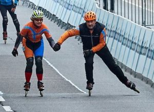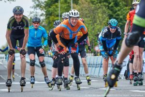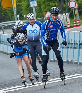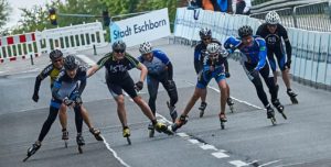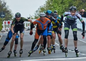 Die Streckenführung ging diesmal zuerst nach Frankfurt rein, und nach ein paar Kurven durch die Stadt erst raus Richtung Taunus. Nachdem das Tempo in Frankfurt etwas verhalten war, konnte sich Michi mit noch drei anderen durch wiederholte Temposteigerungen vom Rest der Gruppe absetzen und kam auch mit dieser Vierergruppe erfolgreich ins Ziel. Die anderen hatten leider ziemliches Pech, bogen wegen schlechter Streckenkennzeichnung falsch ab und fuhren nahezu ungebremst in ein Absperrgitter. Klaus konnte wenigstens gleich weiterfahren, Philipp musste sich erstmal von den Sanis untersuchen lassen. Um danach unter Schmerzen ins Ziel zu skaten. Auskunft der Sanis: entweder bringen wir sie ins Krankenhaus oder sie skaten weiter… Zum Glück haben beide „nur“ starke Prellungen und Schürfwunden, nichts schlimmeres!