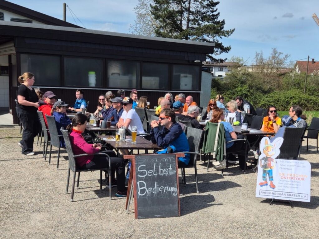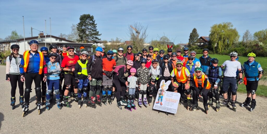 Kaiserwetter, beste Laune und perfekte Organisation – besser geht’s nicht! Start war beim Angelsportverein in Neulußheim – in der Szene bekannt als “Schorsch” – und bei strahlendem Sonnenschein und blauem Himmel gingen diesmal fast 50 gut gelaunte Skaterinnen und Skater an den Start – so viele wie noch nie. Über die alte B36 ging es in südliche Richtung auf Rad- und Feldwegen bis kurz vor Philippsburg, um dort in Richtung Altrhein abzubiegen. An Rheinhausen vorbei führte die Strecke dann direkt in den Biergarten vom “Schorsch”. Die Stimmung war so gut, dass einige gar nicht genug bekommen konnten und die Runde einfach noch ein zweites Mal gedreht haben.